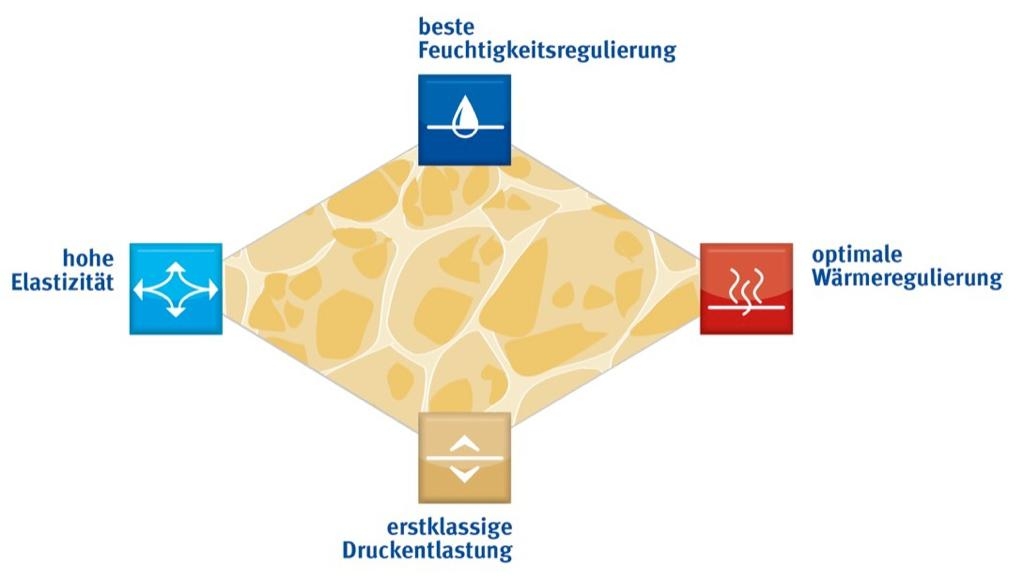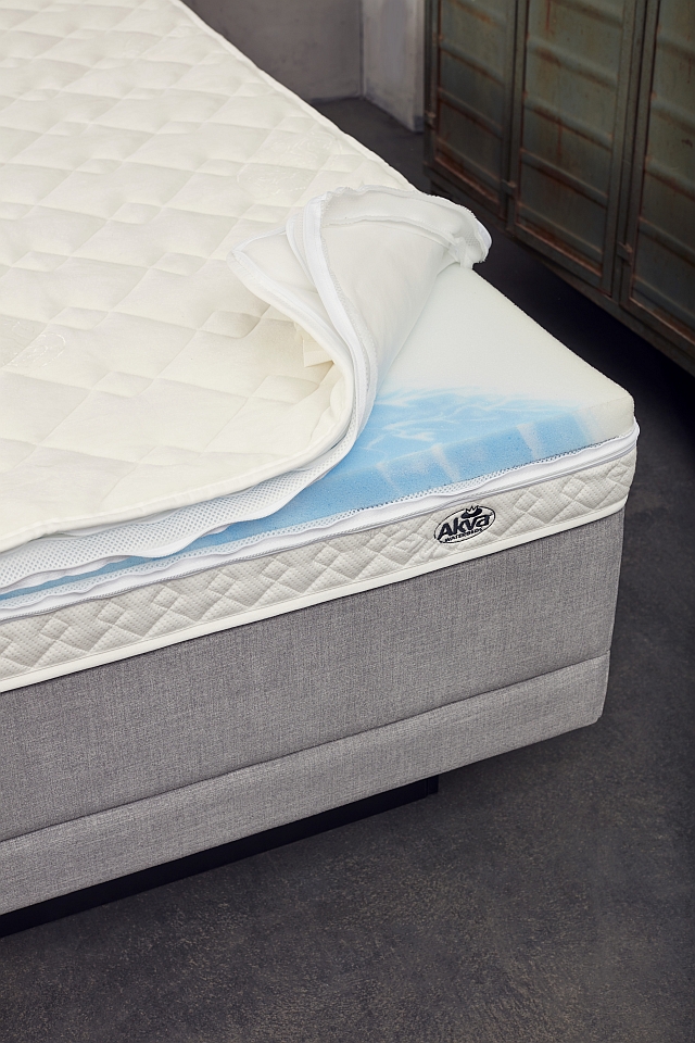 Der LE Topper wird zwischen Bezugober- und unterteil mit Reißverschlüssen befestigt und kann auch in bestehenden Betten nachgerüstet werden. Er besteht aus einer geschlossenen Bezugstasche aus atmungsaktivem 3D Mesh Abstandsgewirke mit einer Seitensteghöhe von ca. 4,5 sm und einer Kaltschaumplatte aus EUCAFELL®.